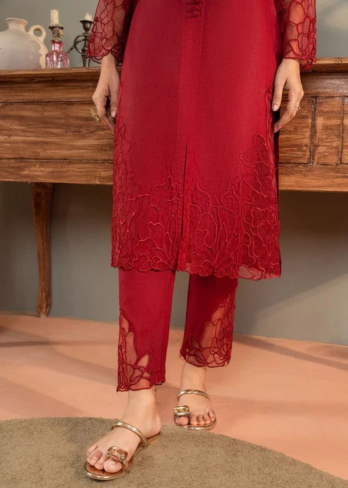 Additional Description | Perfect cuts and stitches of "Burgundy" with exaggerated organza border on the front, sleeves, and trousers in solid color makes it the perfect outfit for the season |