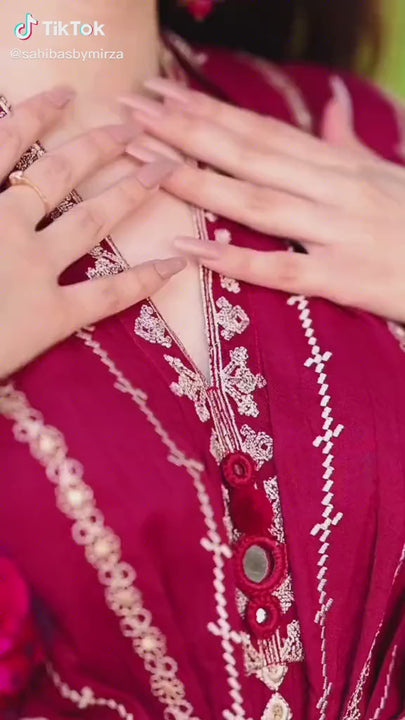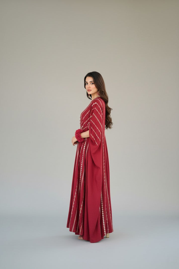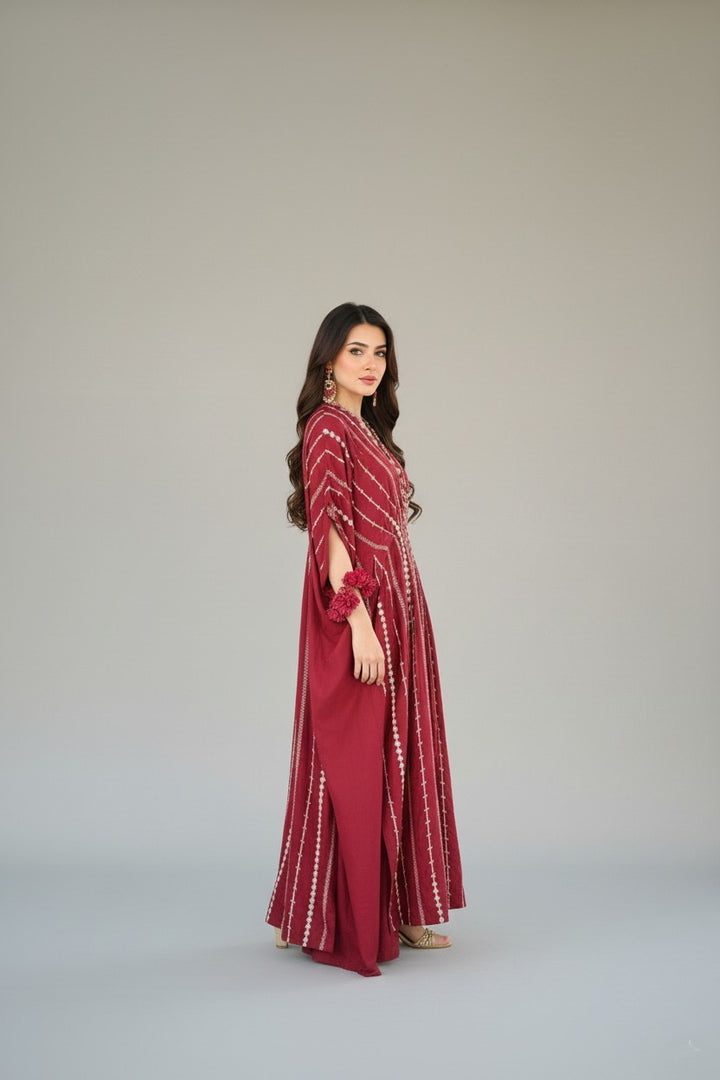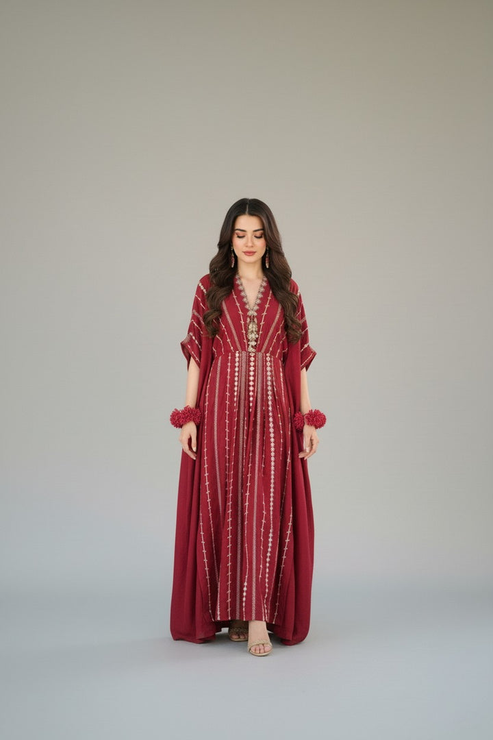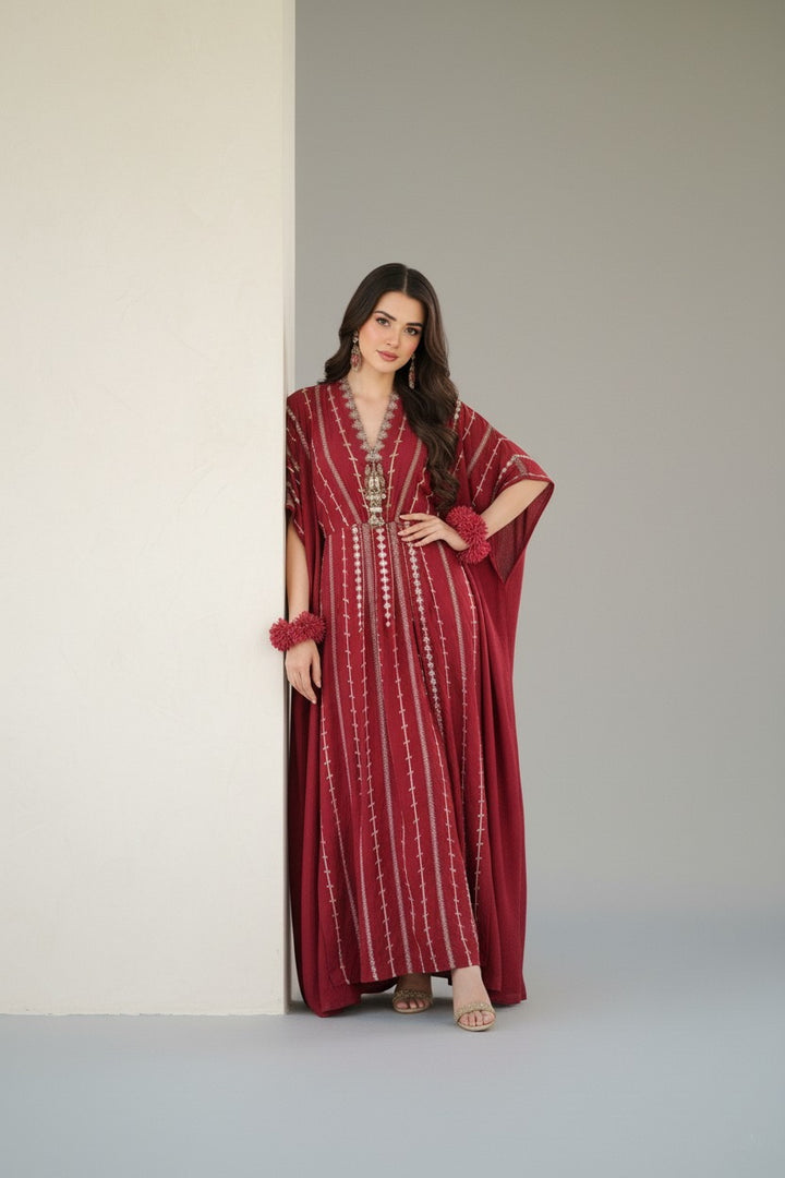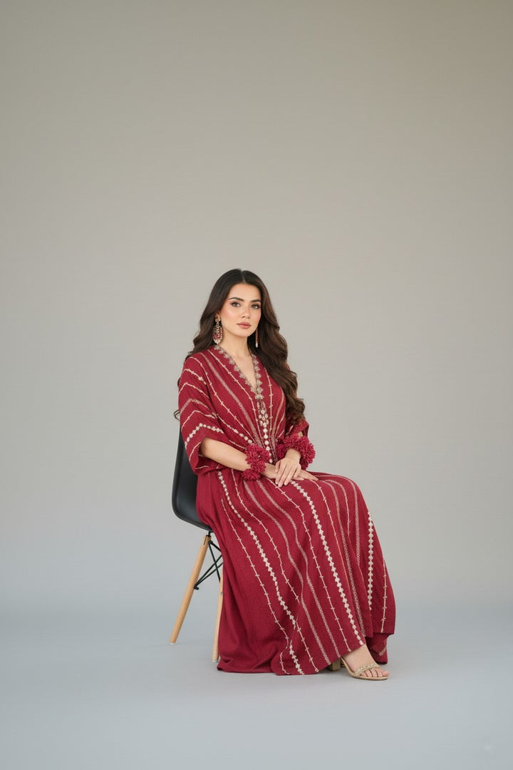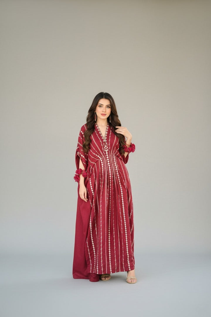 Additional Description | Crimson Grace is a perfect go for a festive day! The stripe-embroidered modern kaftan looks perfect with all the cuts and stitches. The maroon color is a must-have for this season. This is a 1-piece stitched outfit, made of linen fabric – best worn in summer despite its winter-ready richness. |