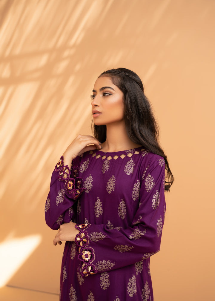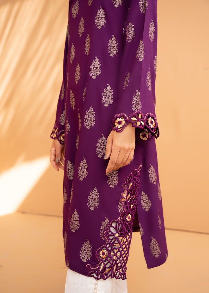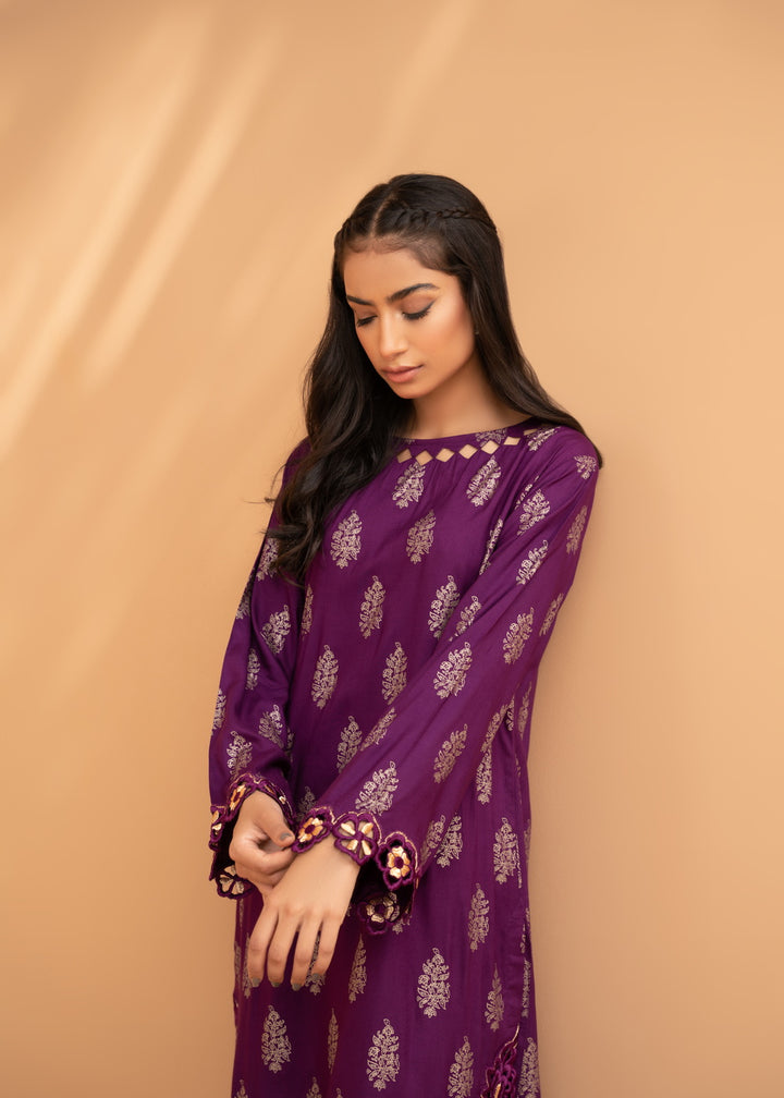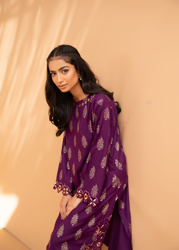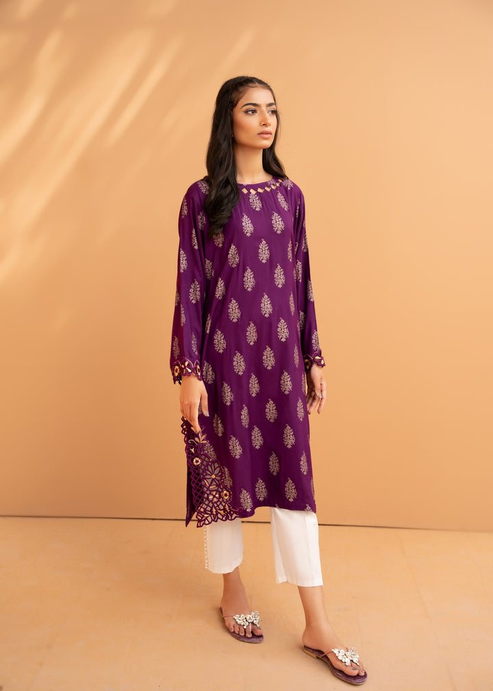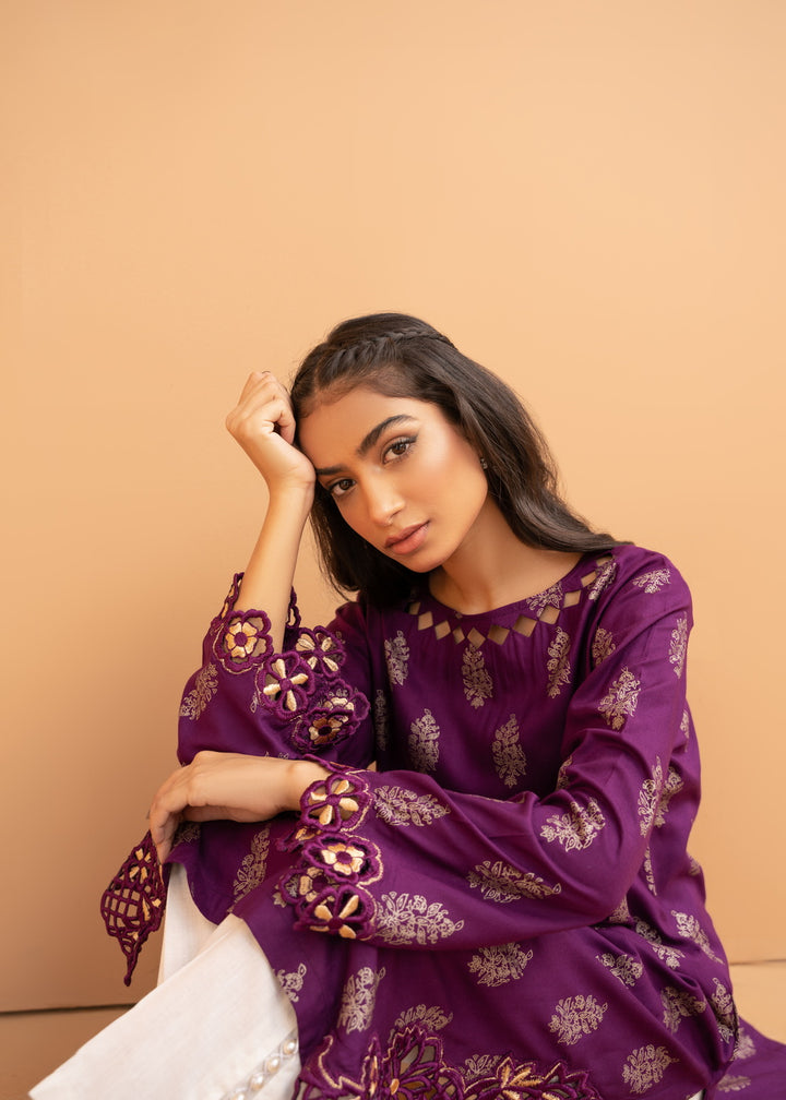 Additional Description | Purple – the color of royalty! Beautifully flaunting away the appliqué work on the printed linen shirt with boat neckline. |