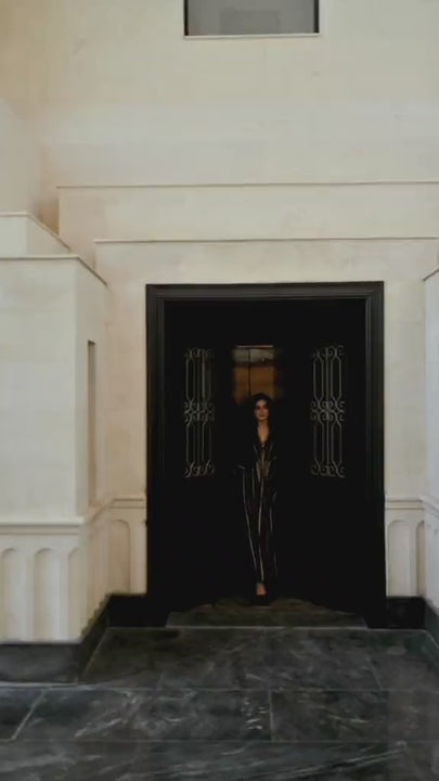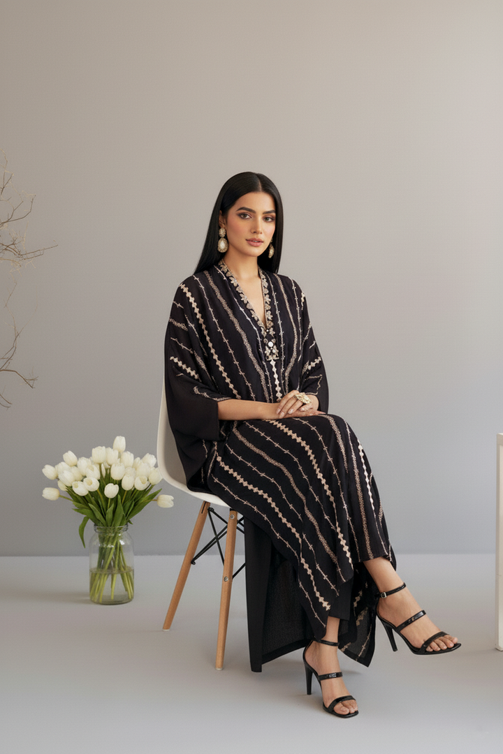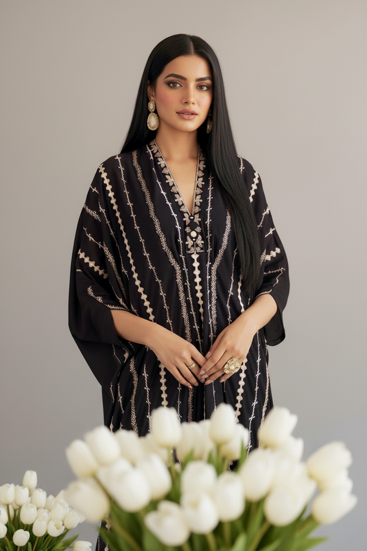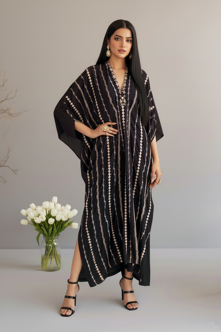Additional Description | Siah Rang-e-Naz kaftan is a perfect go for a festive day! The striped embroidered modern kaftan looks perfect with all the cuts and stitches, offering elegance and ease for your summer wardrobe. |