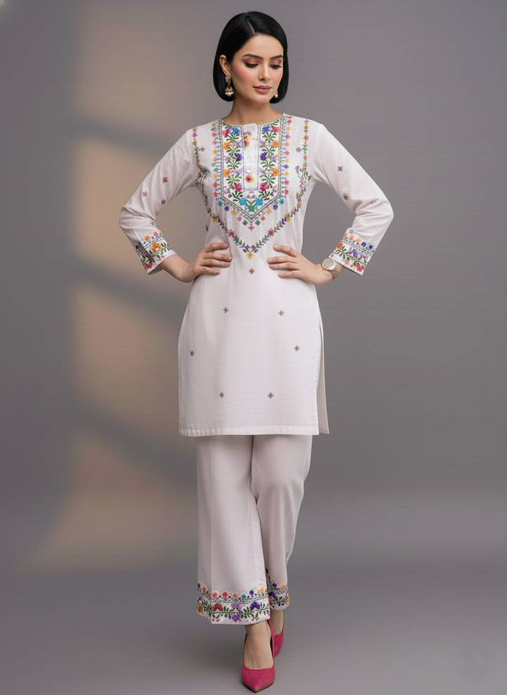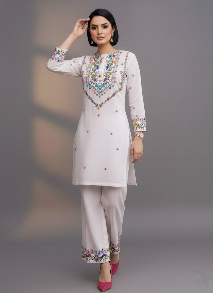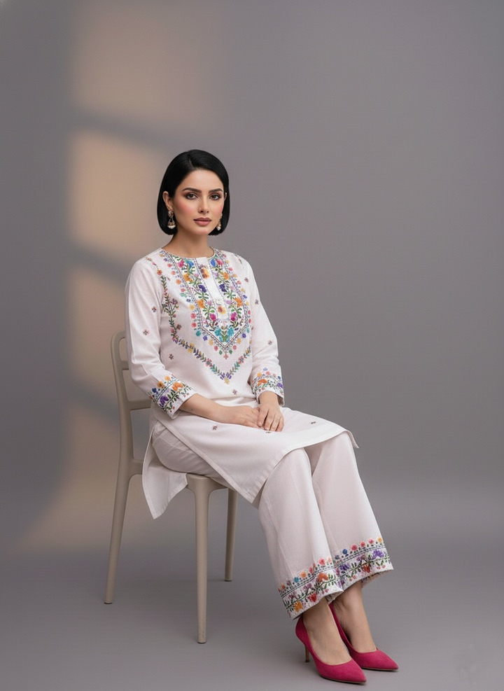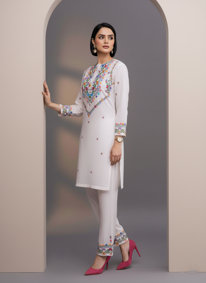 | Additional Description | Swan White: includes shirt with classic multi-head embroidery all-over it, paired up with embroidered plazo pants. |