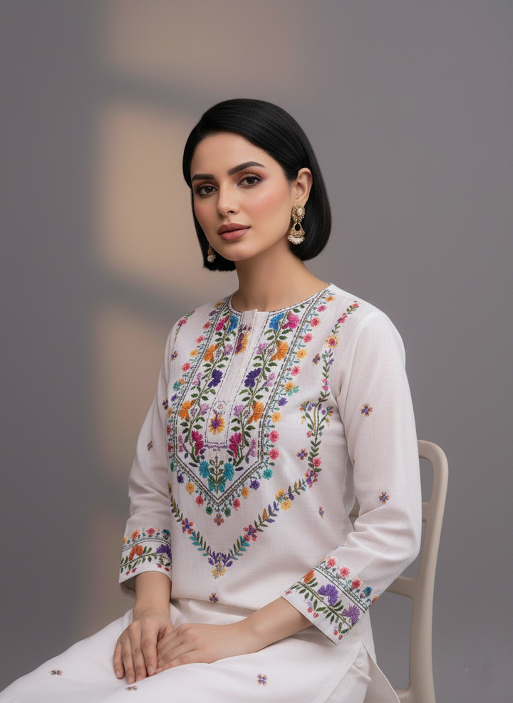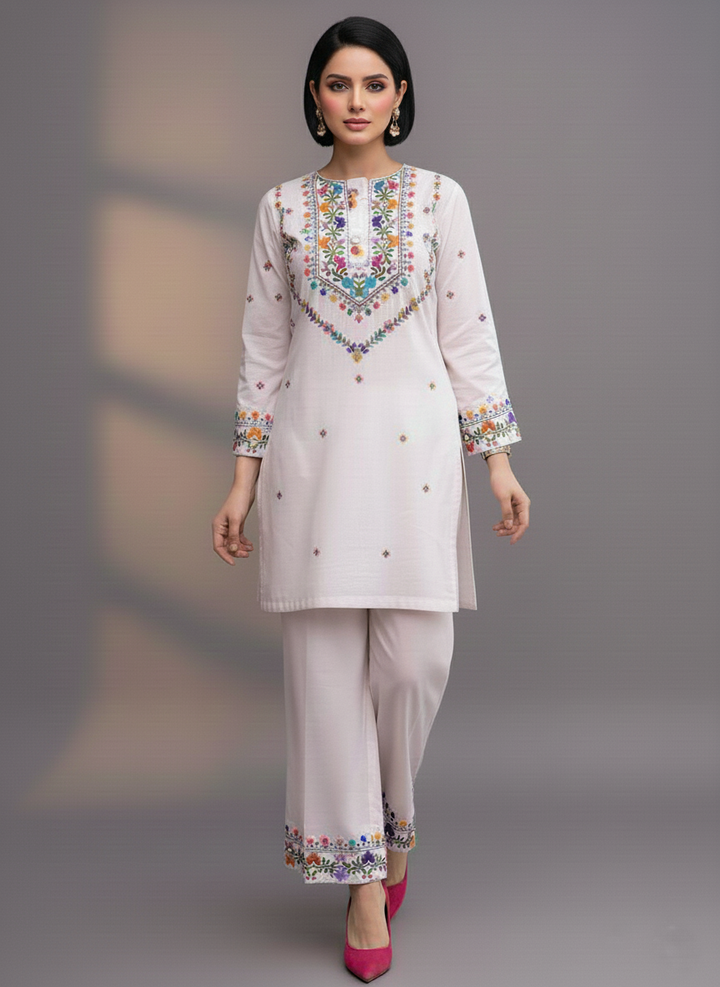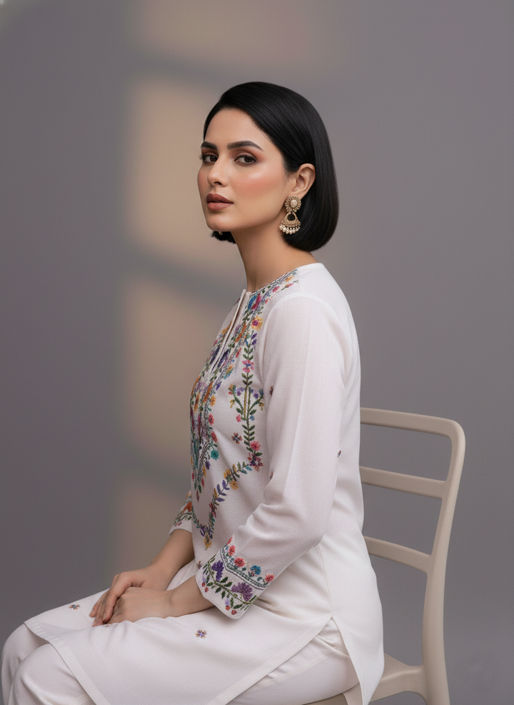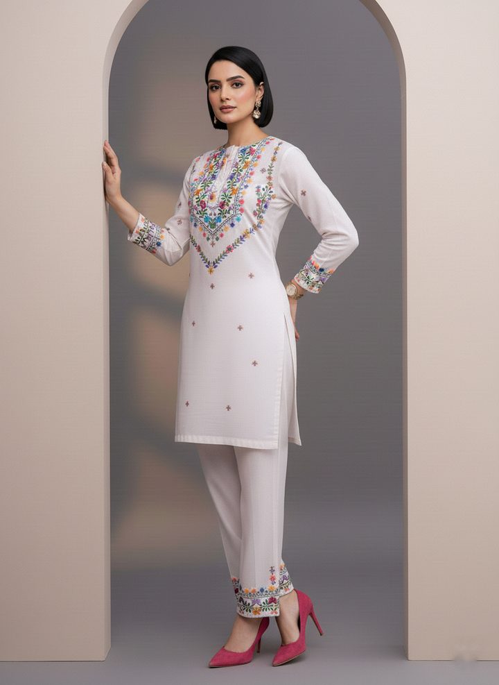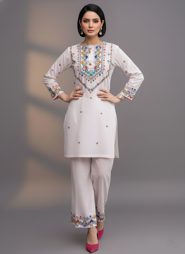 | Additional Description | Swan White: includes shirt with classic multi-head embroidery all-over it, paired up with embroidered plazo pants. |